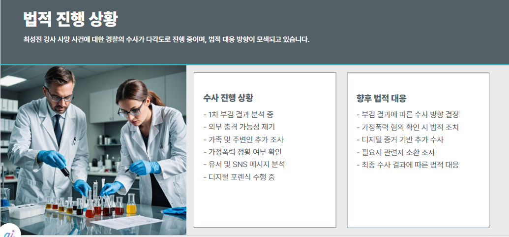 - 가정폭력 정황 여부 일부 지인들의 증언에 따르면, 최 강사는 최근 가정 내에서 심각한 갈등을 겪고 있었으며, 몇 차례 가정폭력 피해를 호소한 적이 있었다는 증언이 나오고 있다. 경찰은 배우자 및 가족을 상대로 구체적인 진술을 확보하고 있으며, 필요시 법적 조치를 검토할 예정이다.