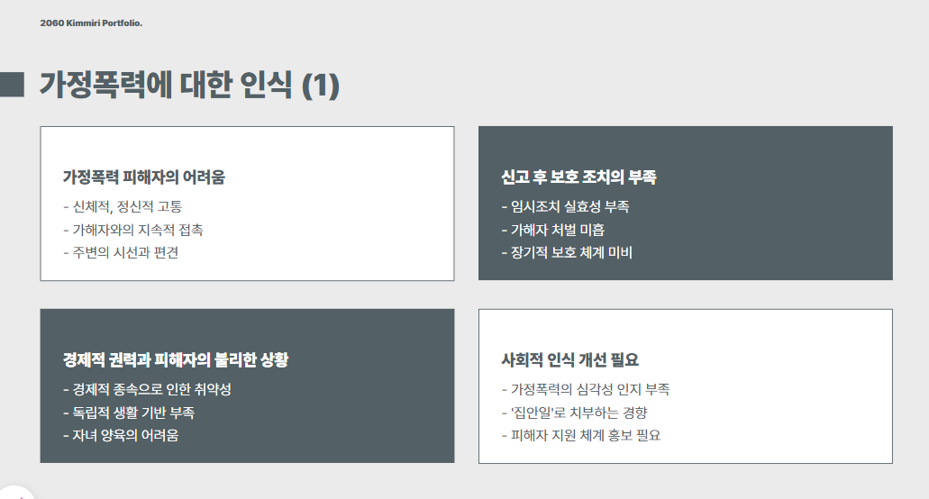 - 가정폭력 피해자의 어려움 가정폭력 피해자는 신고를 하더라도 보호 조치가 부족한 경우가 많고, 법적 절차가 길어지는 동안 계속해서 위험에 노출될 가능성이 크다. 또한, 가해자가 경제적 권력을 갖고 있을 경우 피해자는 더욱 불리한 상황에 처하게 된다.