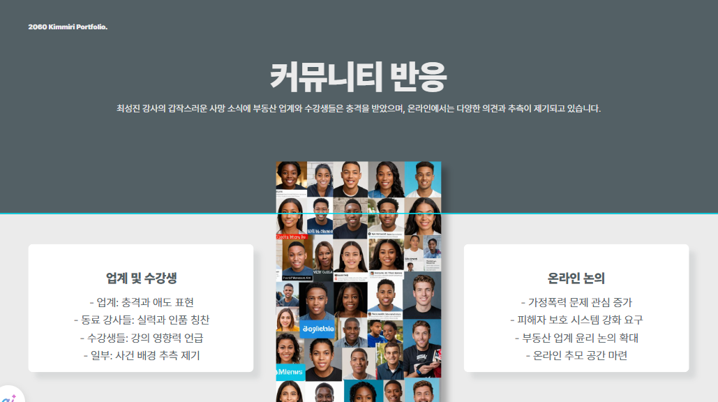 - 수강생 및 일반 대중의 반응 최 강사의 강의를 들었던 수강생들은 "그의 강의를 통해 부동산을 배우며 인생이 바뀌었다"는 등의 반응을 보이며 그의 사망을 애도하고 있다. 한편, 일부 네티즌들은 사건의 배경에 대해 다양한 추측을 제기하며 논란을 일으키고 있다.