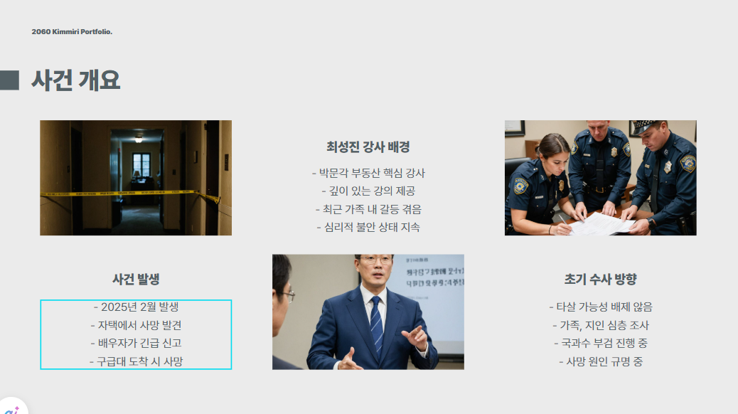 2025년 2월 XX일, 대한민국 부동산 업계에서 명성을 쌓아온 최성진 강사가 자택에서 숨진 채 발견되는 충격적인 사건이 발생했다. 경찰은 초기에 타살 가능성을 배제하지 않고 수사를 진행했으며, 이후 그의 가족과 지인들을 상대로 심층 조사를 진행했다.