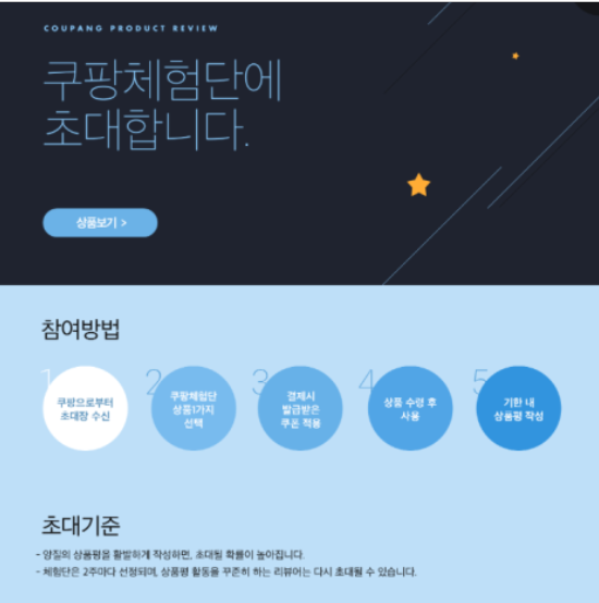 - 쿠팡은 공식적으로 문자 알림을 통해 초대장을 보내며, 체험단과 관련된 모든 활동은 쿠팡 홈페이지 내에서 진행된다.