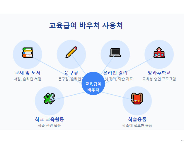 교육급여 바우처는 다음과 같은 교육 관련 항목에 사용할 수 있습니다: