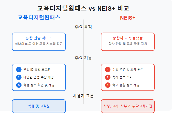 교육디지털원패스와 NEIS+는 모두 교육 관련 서비스지만, 그 목적과 기능에는 중요한 차이가 있습니다: