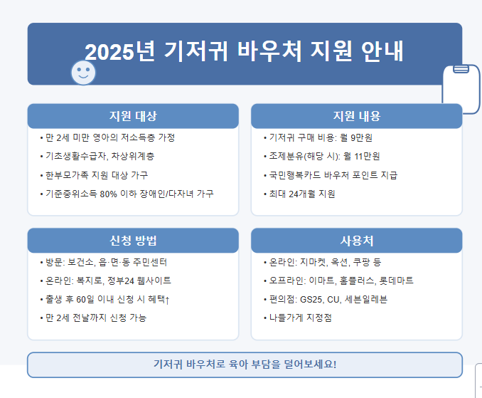 저소득층 가정의 육아 부담을 덜어주기 위한 '기저귀 바우처 지원 사업'에 대해 자세히 알아보겠습니다. 2025년 기준 최신 정보를 바탕으로 지원 대상부터 신청 방법, 사용처까지 모든 내용을 정리했습니다.