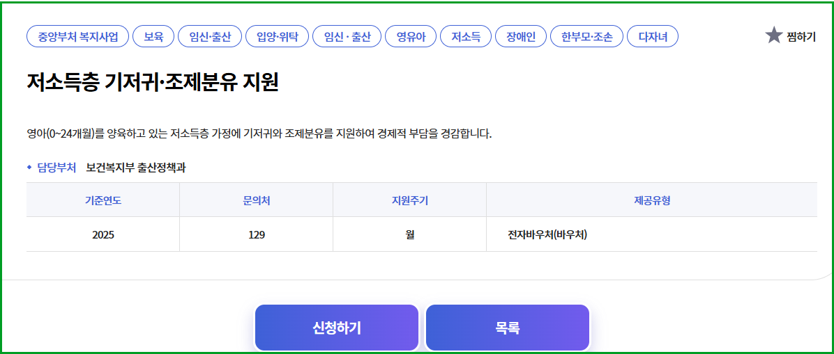 - 로그인 후 "기저귀·조제분유 지원" 메뉴에서 신청서 작성 및 제출